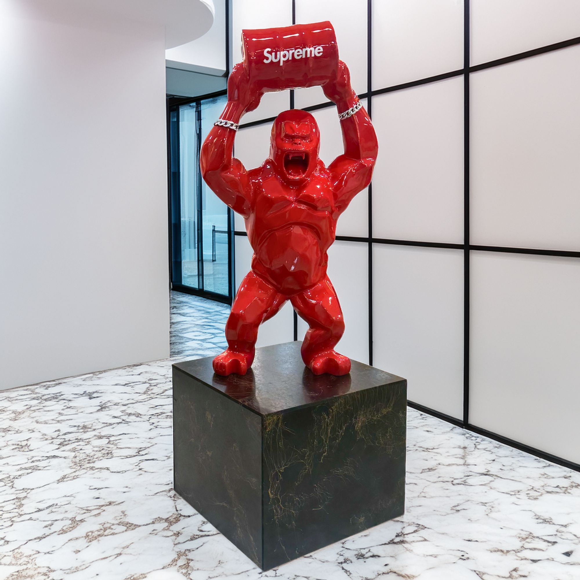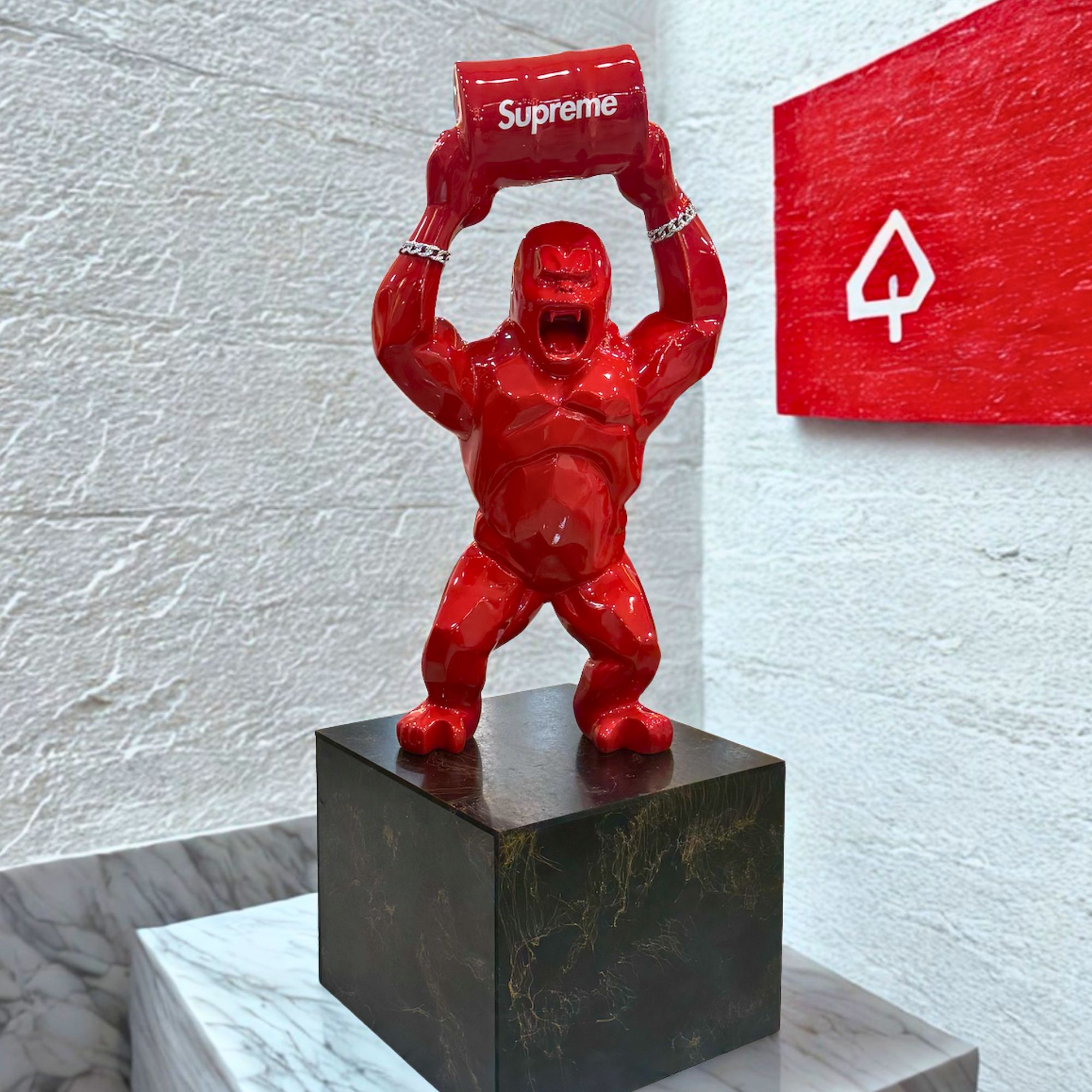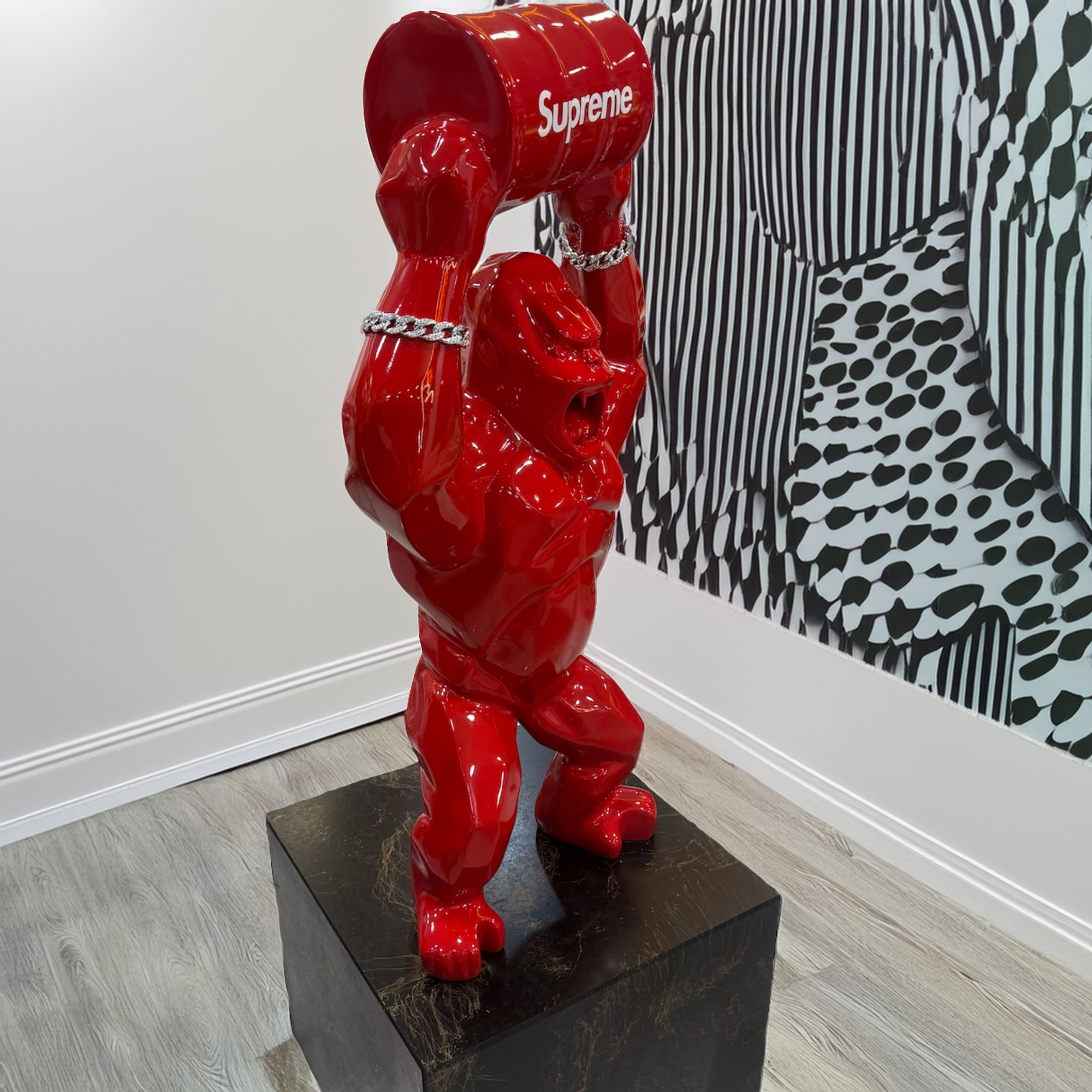 Gorila rojo estilo King Kong 🦍 en fibra de vidrio artesanal con acabado brillante. Incluye base marmoleada. Medidas con base: 144×50×52 cm. ¡Arte moderno y exclusivo! 💥🏛️