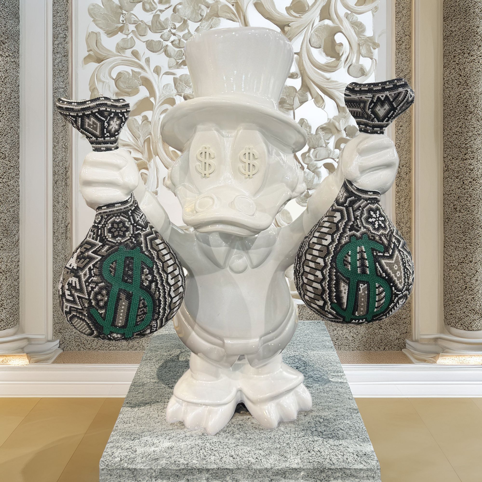 Decora tus espacios con esta figura exclusiva de lujo 🖤✨ elaborada en fibra de vidrio de alta resistencia. Su acabado en blanco brillante aporta modernidad y distinción, mientras que los costales estilo huichol 💰 con incrustaciones de pedrería ✨ reflejan abundancia, prosperidad y un estilo único.