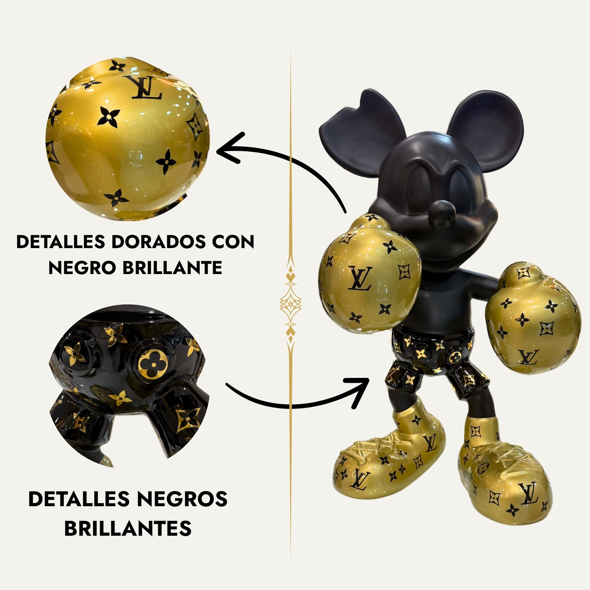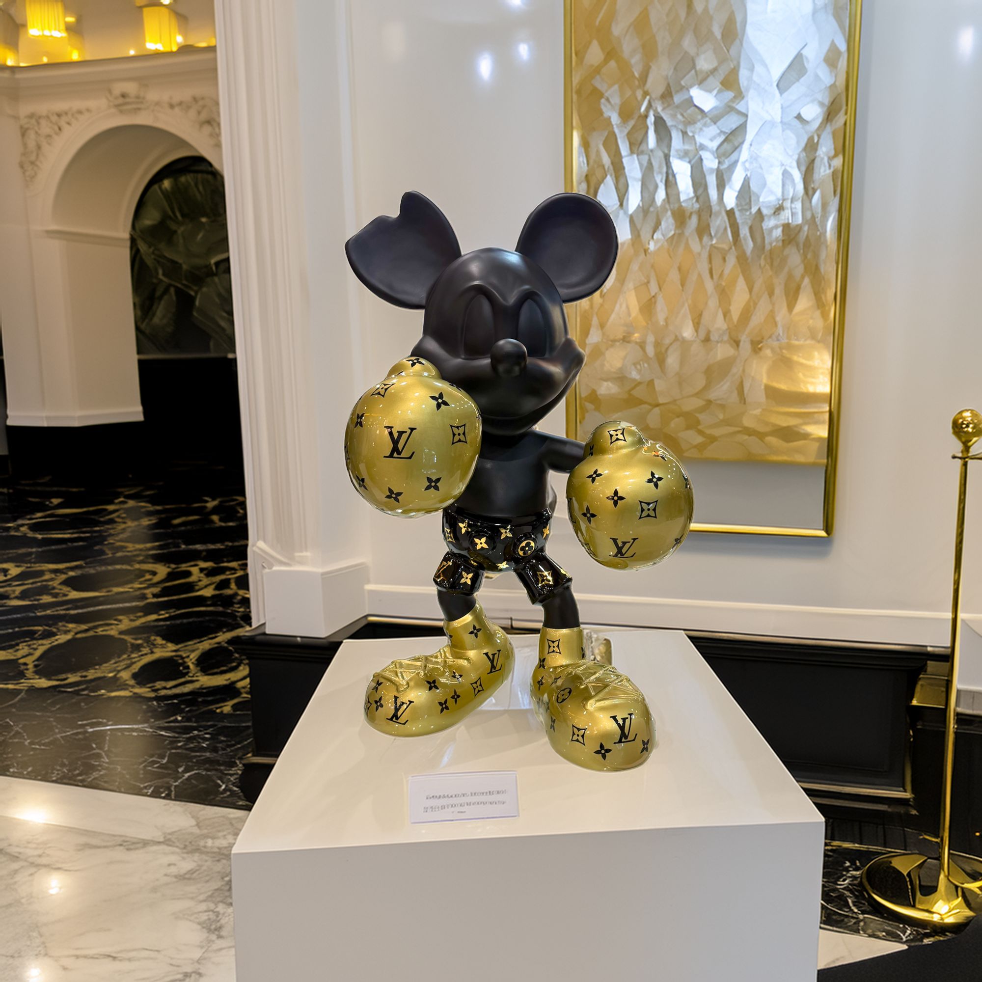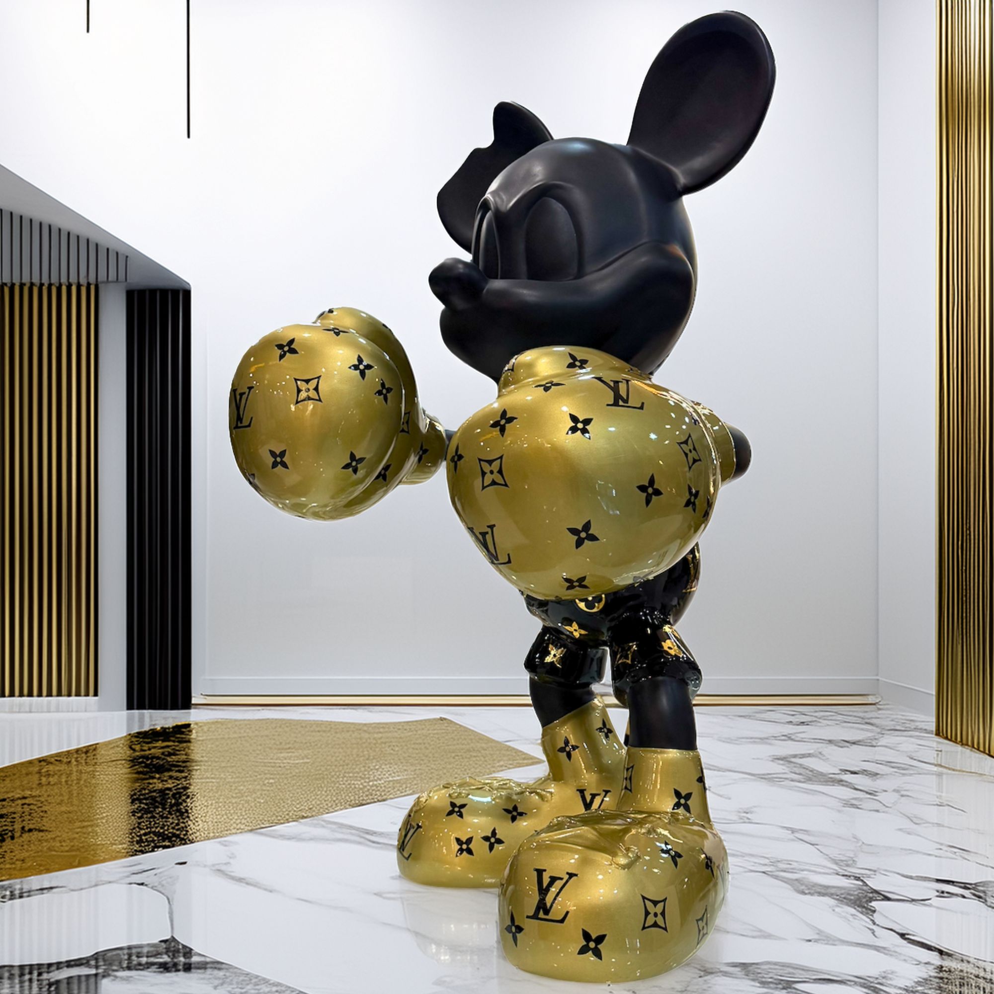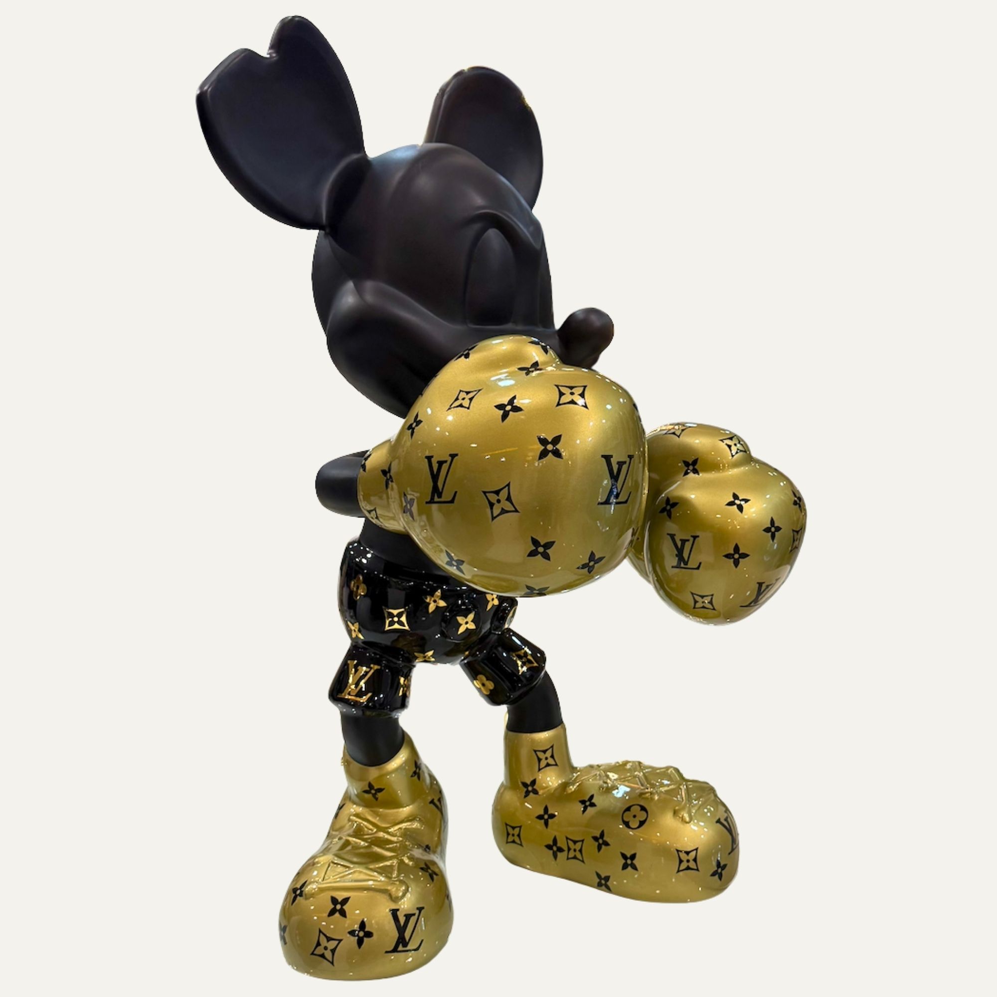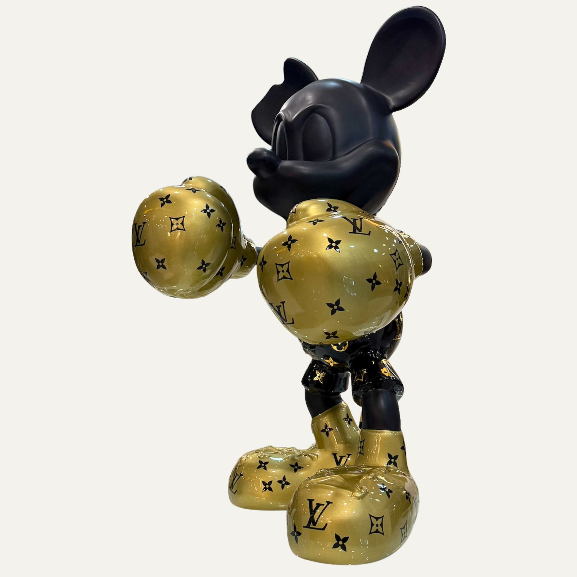 Figura decorativa de lujo Mickey Mouse boxeador negro y dorado con detalles estilo monograma, ideal para dar un toque moderno y exclusivo a cualquier espacio.