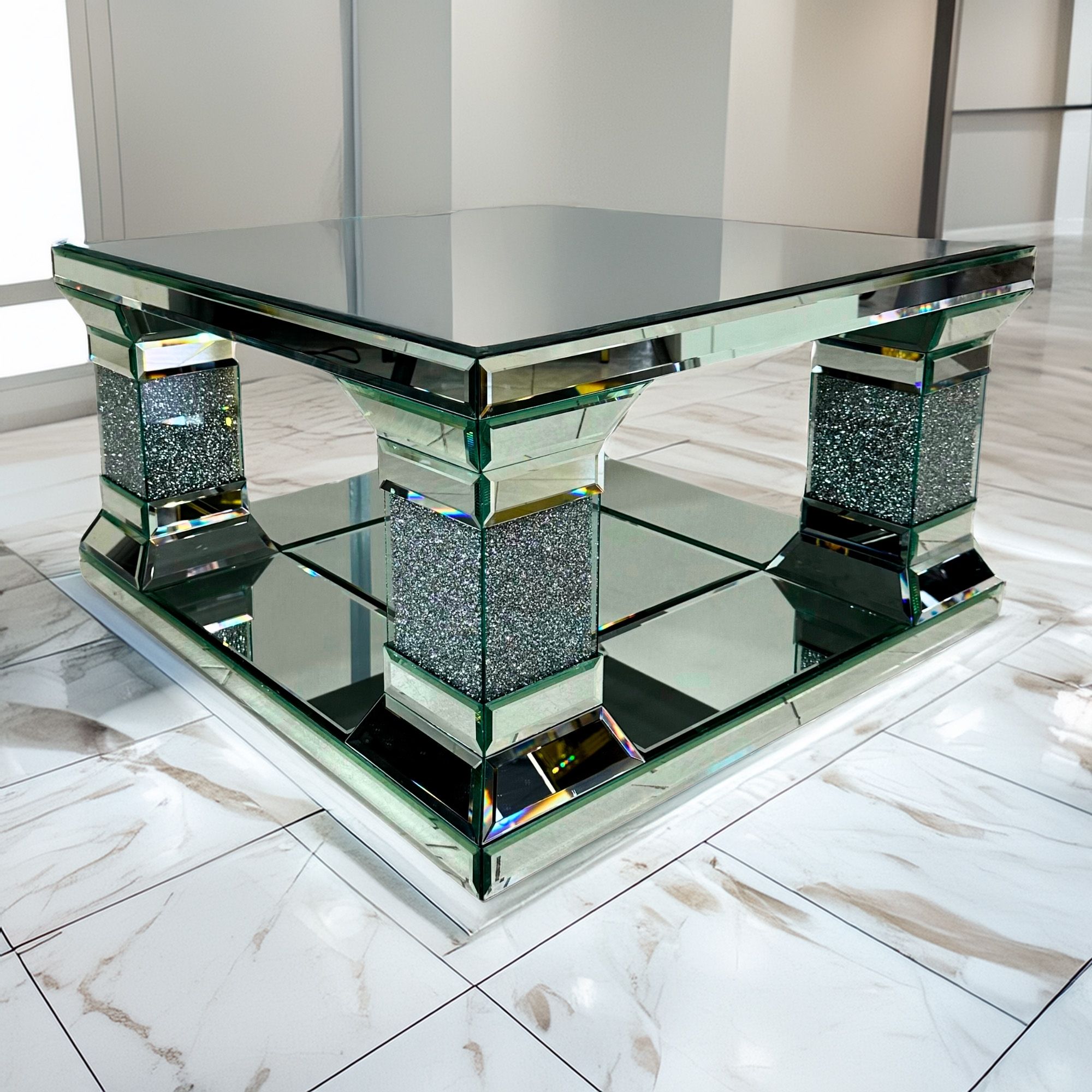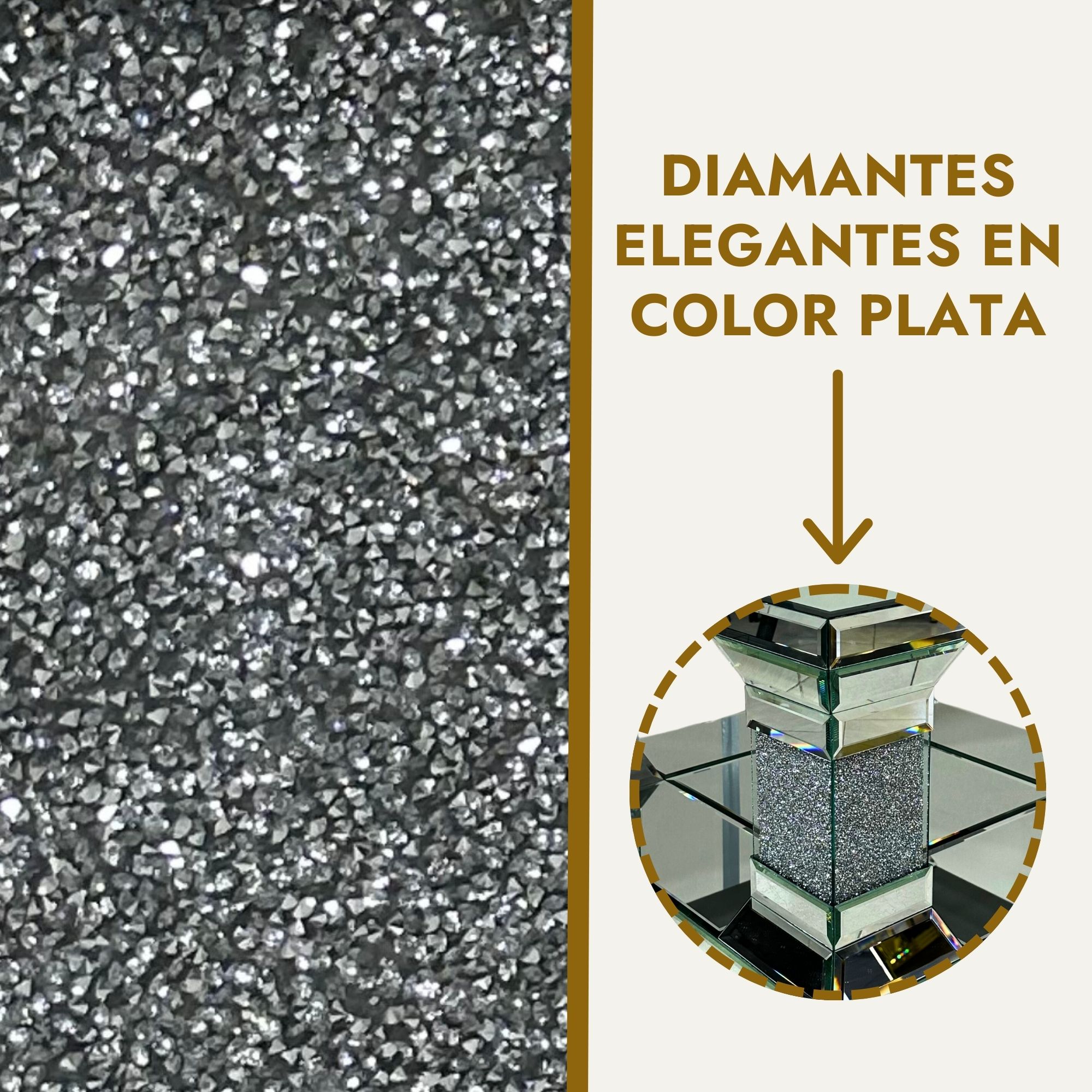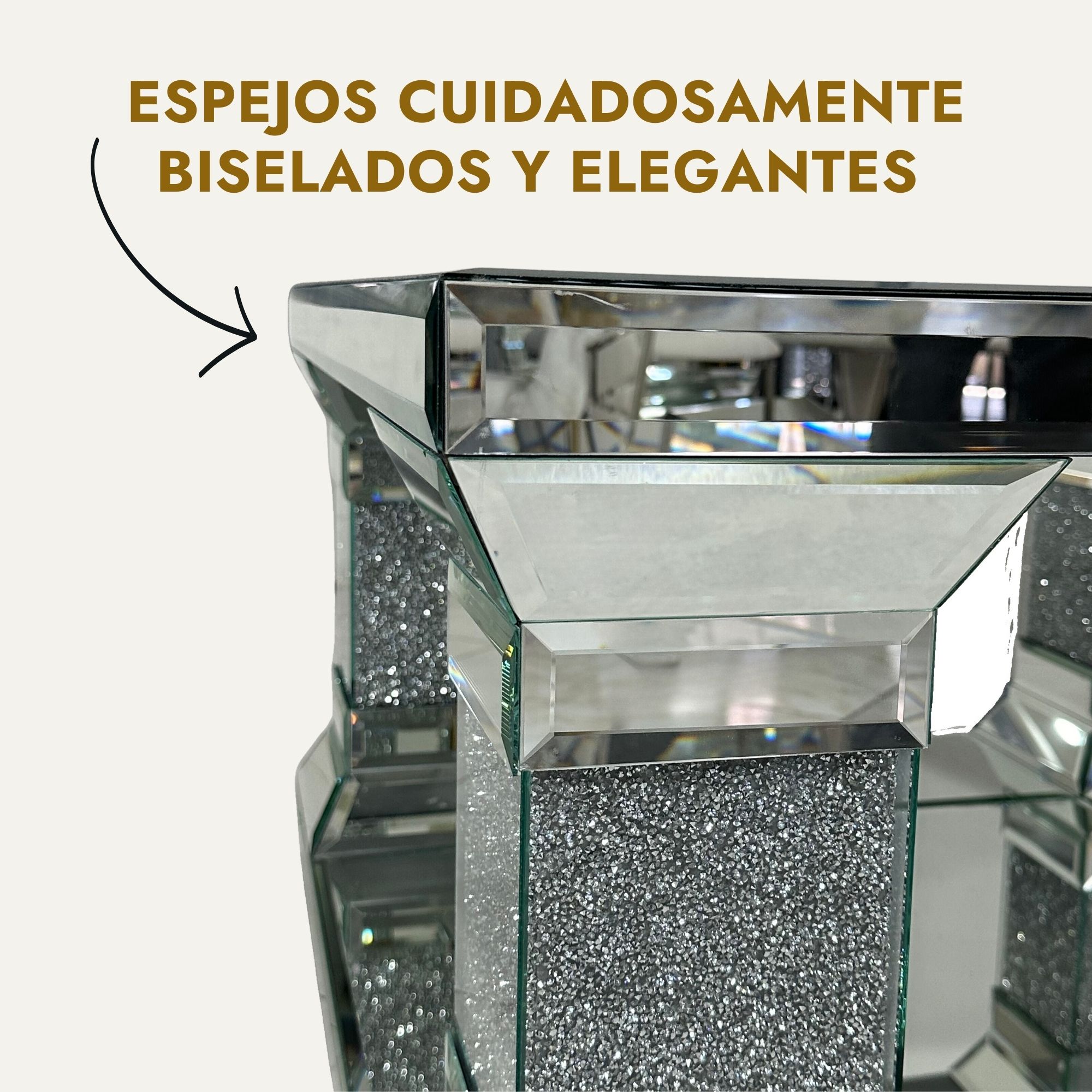 - Forrada con Cristales Biselados Elegantes: Cada superficie de la mesa está revestida con cristales biselados finamente tratados, que capturan la luz de manera única, creando un efecto visual deslumbrante y añadiendo un toque de lujo a cualquier ambiente.