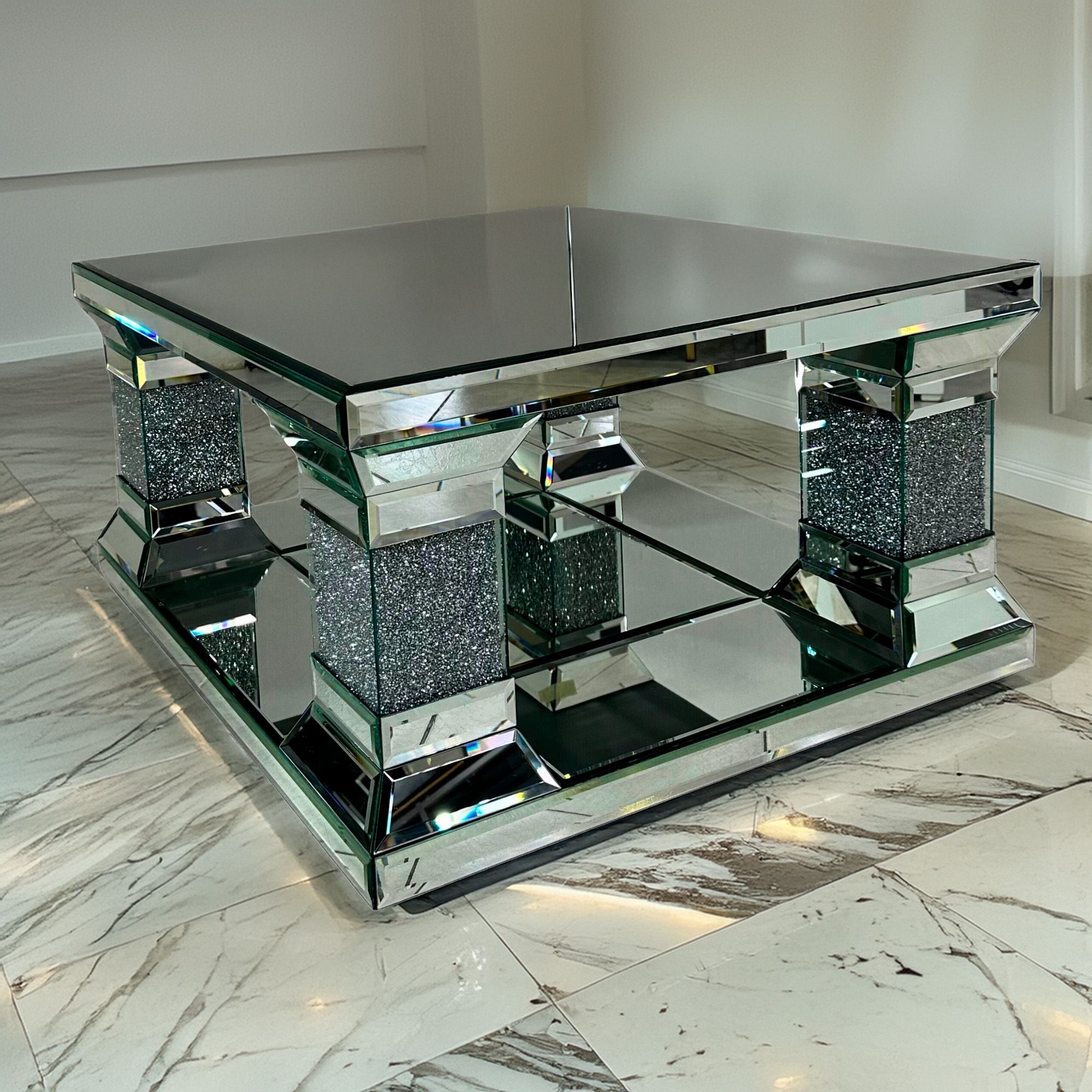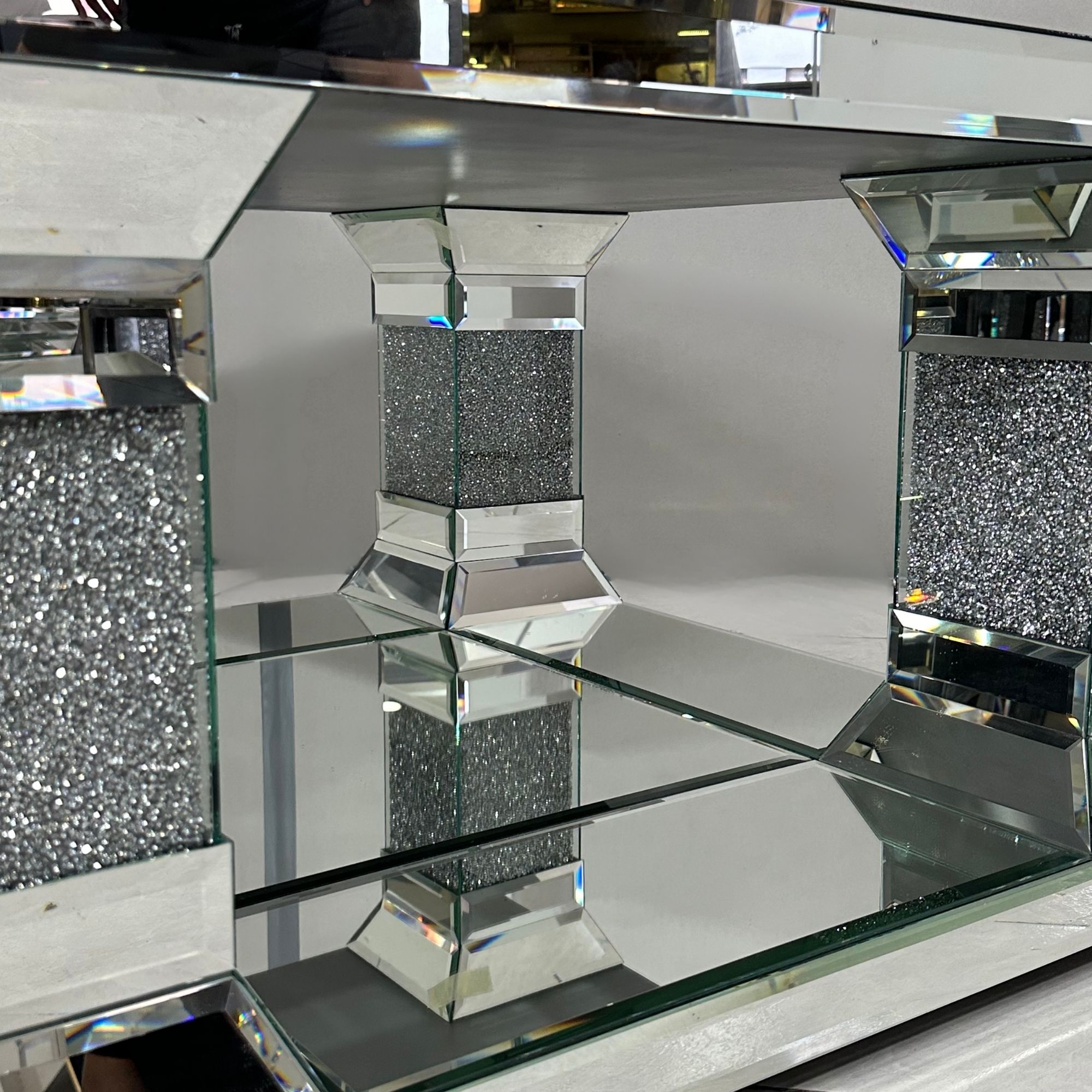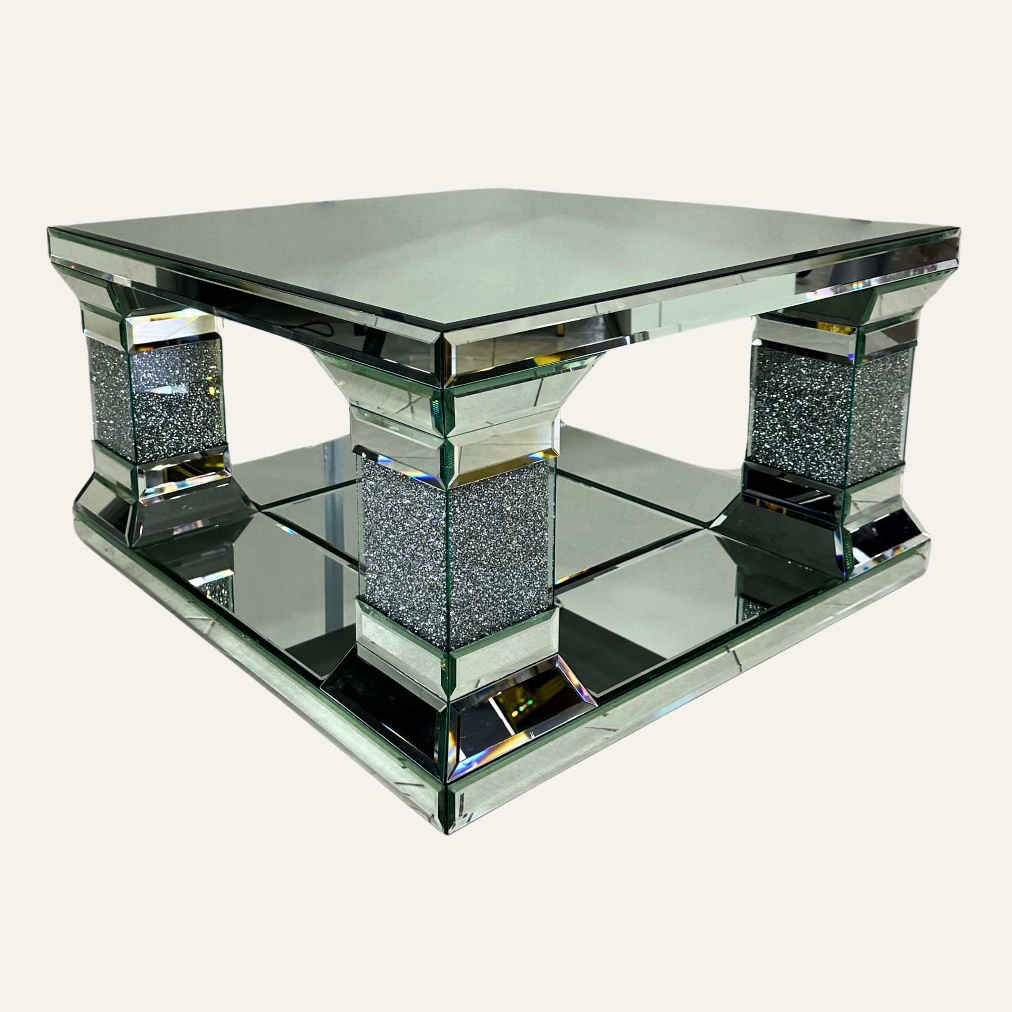 - Forrada con Cristales Biselados Elegantes: Cada superficie de la mesa está revestida con cristales biselados finamente tratados, que capturan la luz de manera única, creando un efecto visual deslumbrante y añadiendo un toque de lujo a cualquier ambiente.