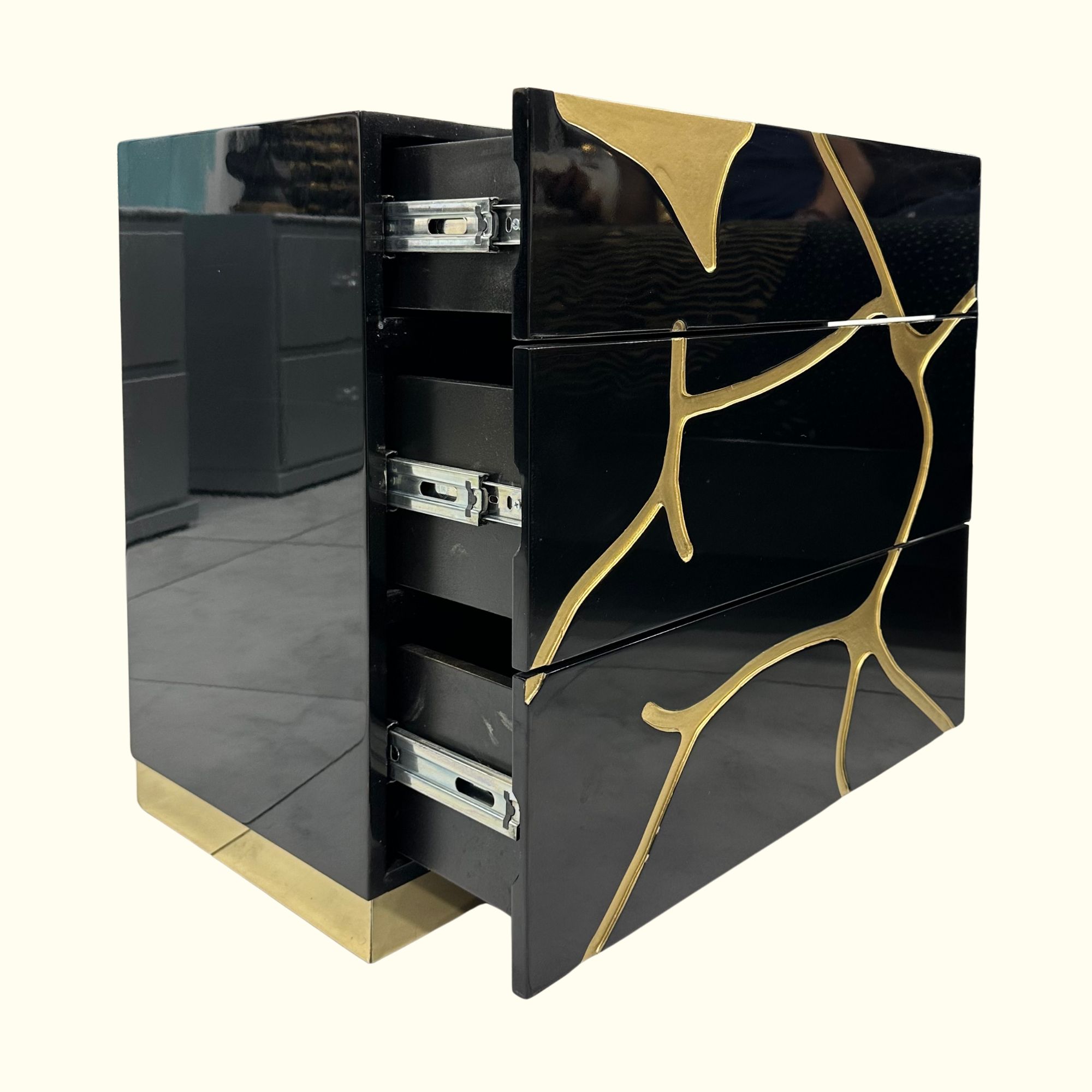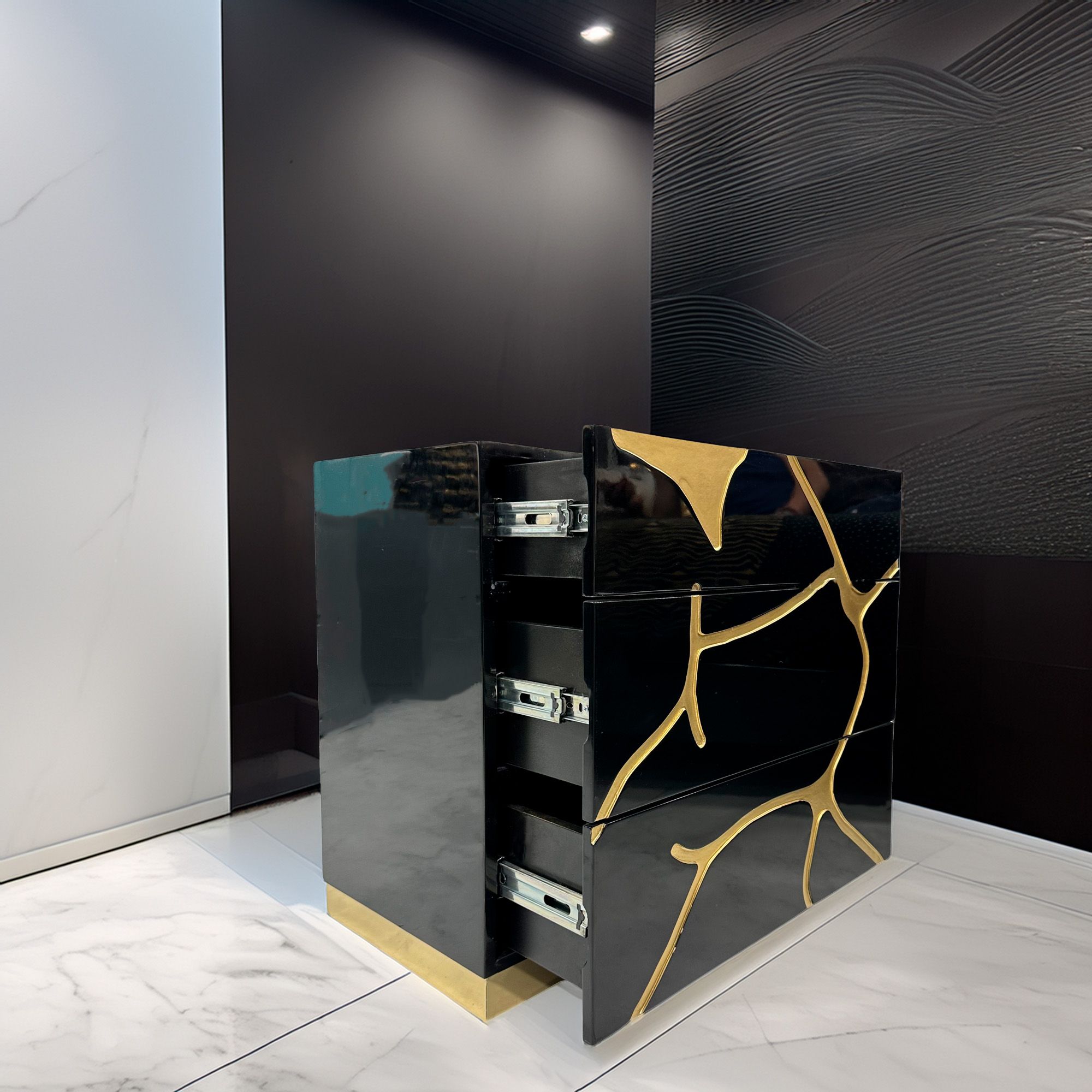 Este buró tallado a mano combina el arte artesanal con un diseño moderno de alto brillo tipo piano, ideal para quienes buscan elegancia sin sacrificar funcionalidad.